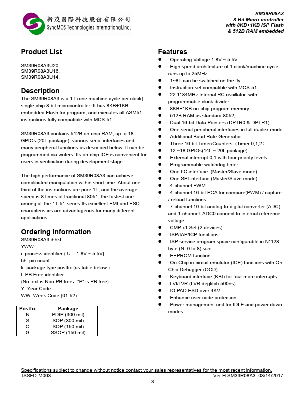 The SM39R08A3 is a 1T (one machine cycle per clock) single-chip 8-bit microcontroller. It has 8KB+1KB embedded Flash for program, and executes all ASM51 instructions fully compatible with MCS-51.