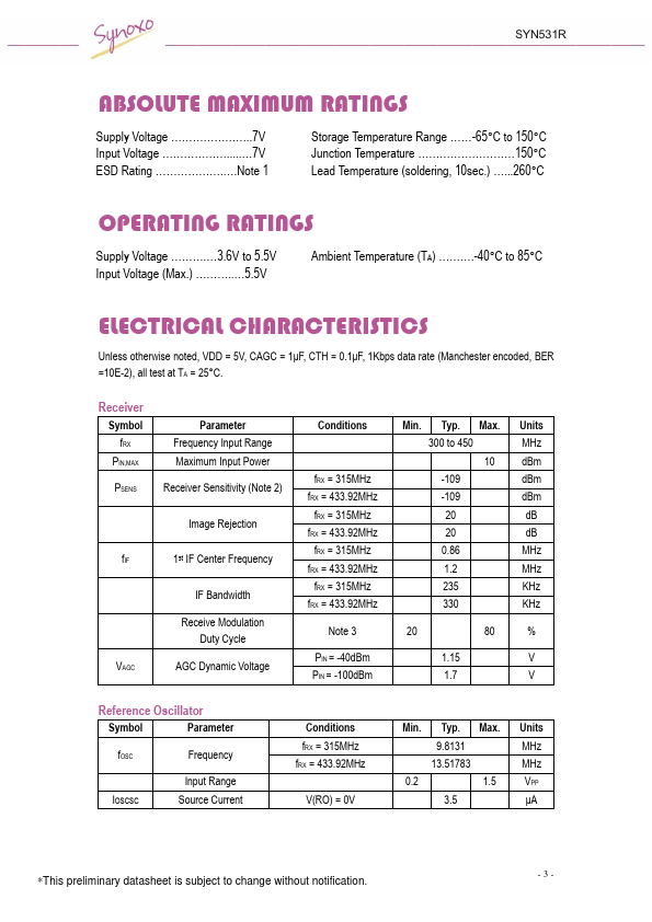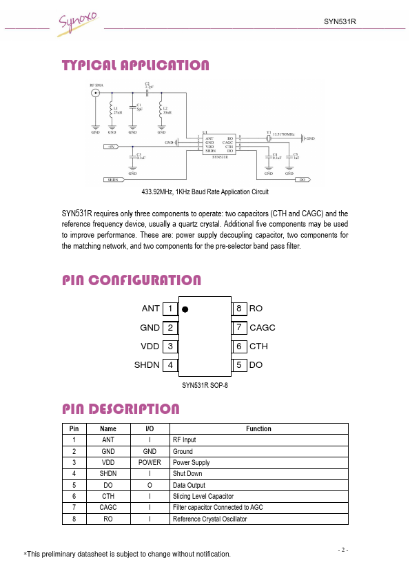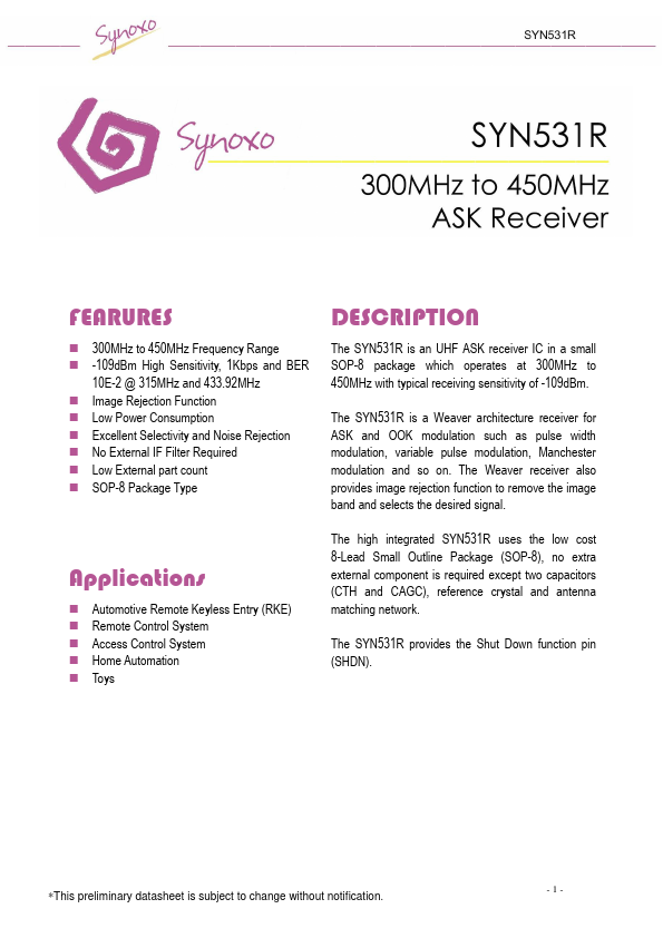 The SYN531R is an UHF ASK receiver IC in a small SOP-8 package which operates at 300MHz to 450MHz with typical receiving sensitivity of -109dBm. The SYN531R is a Weaver architecture receiver for ASK and OOK modulation such as pulse width modulation, variable pulse modulation, Manchester modulation and so on. The Weaver receiver also provides image rejection function to remove the image band and selects the desired...