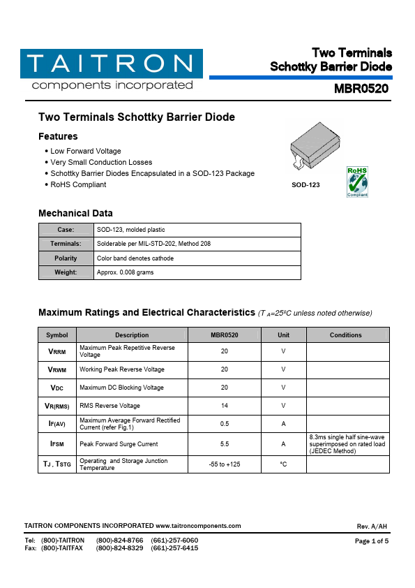 Maximum Peak Repetitive Reverse Voltage Working Peak Reverse Voltage VDC Maximum DC Blocking Voltage VR(RMS) IF(AV) RMS Reverse Voltage Maximum Average Forward Rectified Current (refer Fig.1) IFSM Peak Forward Surge Current TJ , TSTG Operating and Storage Junction Temperature MBR0520 20 20 20 14 0.5 5.5 -55 to +125 Unit Conditions V V V V A 8.3ms single half sine-wave A superimposed on rated load (JEDEC Method) °C TAITRON PONENTS INCORPORATED .taitronponents.