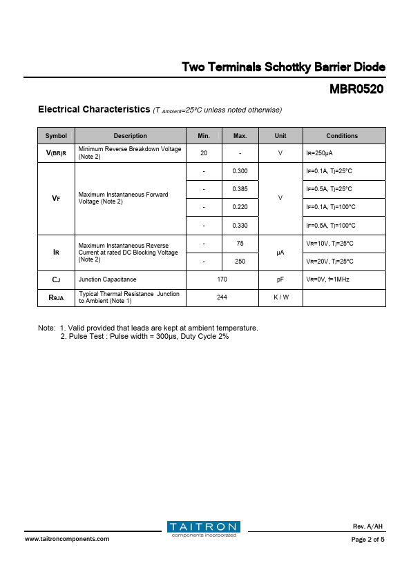 A/AH Page 1 of 5 Two Terminals Schottky Barrier Diode MBR0520 Electrical Characteristics (T Ambient=25ºC unless noted otherwise) Symbol V(BR)R Description Minimum Reverse Breakdown Voltage (Note 2) VF Maximum Instantaneous Forward Voltage (Note 2) Maximum Instantaneous Reverse IR Current at rated DC Blocking Voltage (Note 2) CJ RθJA Junction Capacitance Typical Thermal Resistance Junction to Ambient (Note 1) Min.