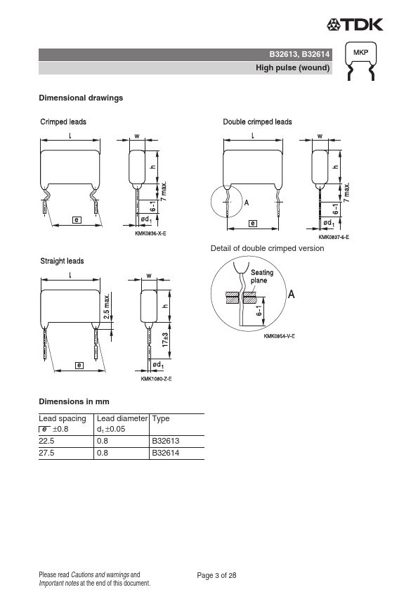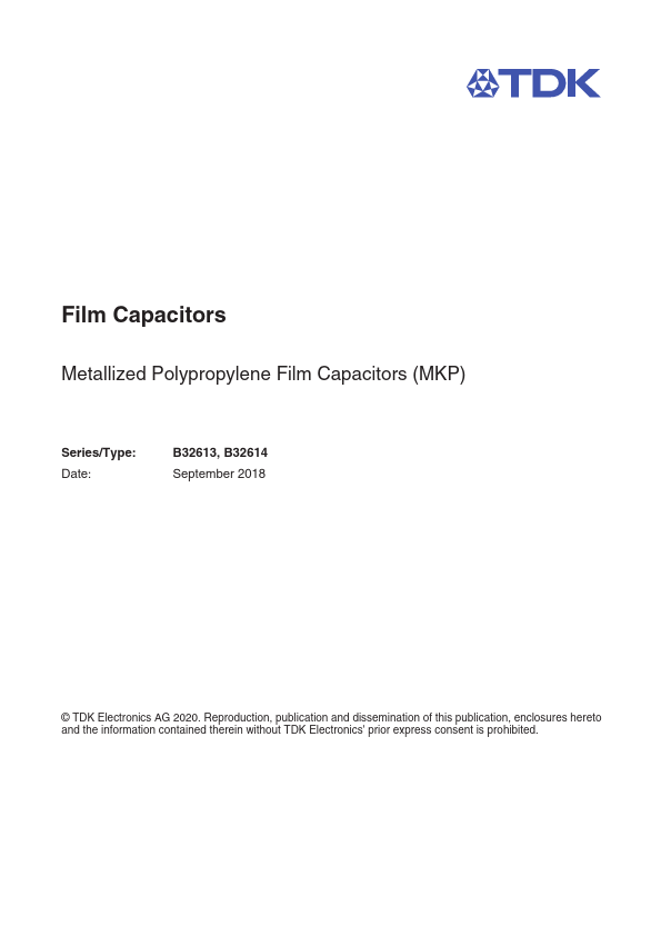 Film Capacitors Metallized Polypropylene Film Capacitors (MKP) Series/Type: B32613, B32614 September 2018 © TDK Electronics AG 2020. Reproduction, publication and dissemination of this publication, enclosures hereto and the information contained therein without TDK Electronics' prior express consent is prohibited.