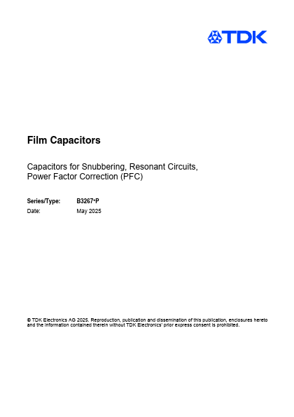 Film Capacitors Capacitors for Snubbering, Resonant Circuits, Power Factor Correction (PFC) Series/Type: B3267 P May 2025 © TDK Electronics AG 2025. Reproduction, publication and dissemination of this publication, enclosures hereto and the information contained therein without TDK Electronics' prior express consent is prohibited.