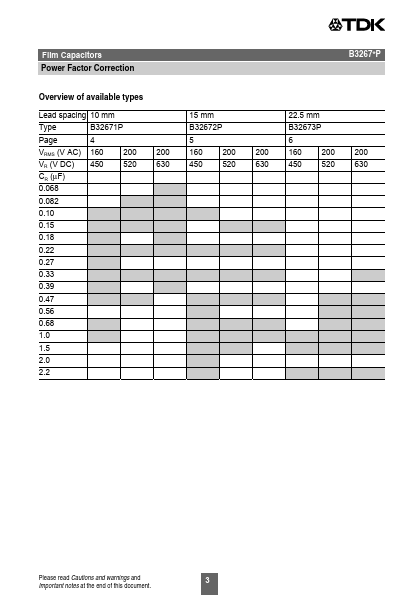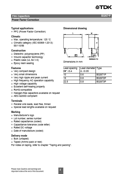 Film Capacitors Capacitors for Snubbering, Resonant Circuits, Power Factor Correction (PFC) Series/Type: B3267 P May 2025 © TDK Electronics AG 2025. Reproduction, publication and dissemination of this publication, enclosures hereto and the information contained therein without TDK Electronics' prior express consent is prohibited.