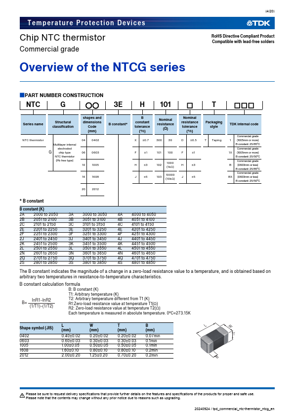 Each thermistor consists of a bination of two to four of the following materials:Mn, Ni, Co, and Cu. NTC thermistors are semiconductor resistors that exhibit decreasing resisrance with increasing temperature. TDK thermistors have low thermal time constants which result in extremely high rates of resistance change to accurately track the temperature.