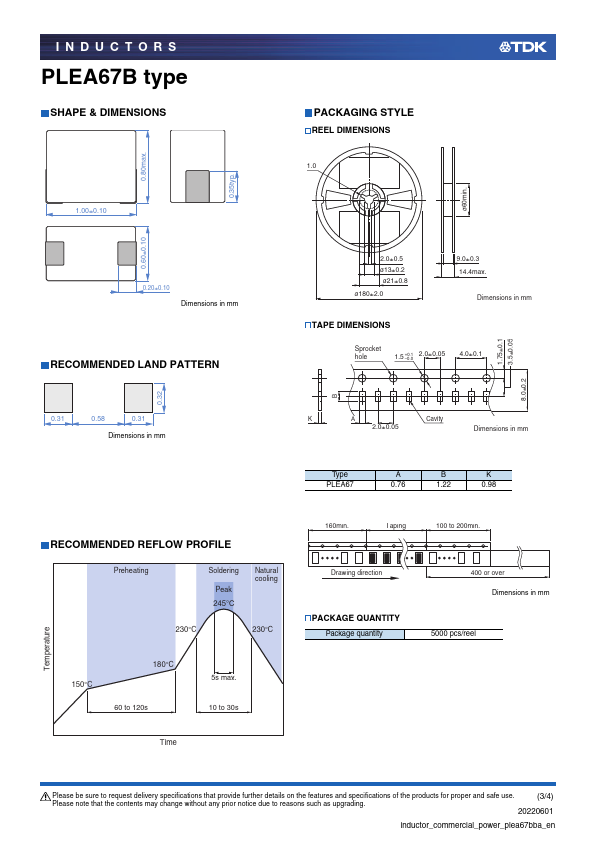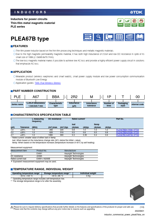 INDUCTORS Inductors for power circuits Thin-film metal magnetic material PLE series RoHS Cl Br REACH Halogen SVHC-Free Free Pb Lead Free PLEA67B type.