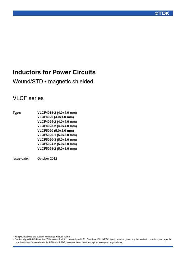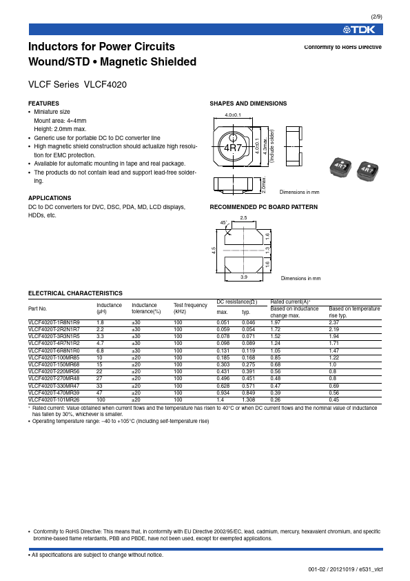 Inductors for Power Circuits Wound/STD magnetic shielded VLCF series Type: Conformity to RoHS Directive: This means that, in conformity with EU Directive 2002/95/EC, lead, cadmium, mercury, hexavalent chromium, and specific bromine-based flame retardants, PBB and PBDE, have not been used, except for exempted applications.