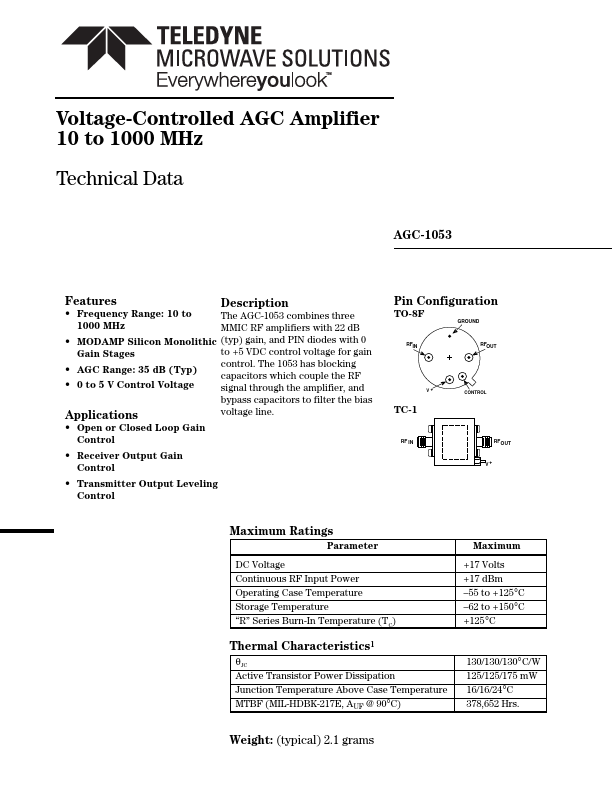 Frequency Range: 10 to The AGC-1053 combines three 1000 MHz MMIC RF amplifiers with 22 dB - MODAMP Silicon Monolithic (typ) gain, and PIN diodes with 0 Gain Stages to +5 VDC control voltage for gain - AGC Range: 35 dB (Typ) control. The 1053 has blocking capacitors which couple the RF - 0 to 5 V Control Voltage signal through the amplifier, and bypass capacitors to filter the bias.