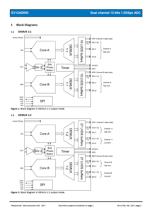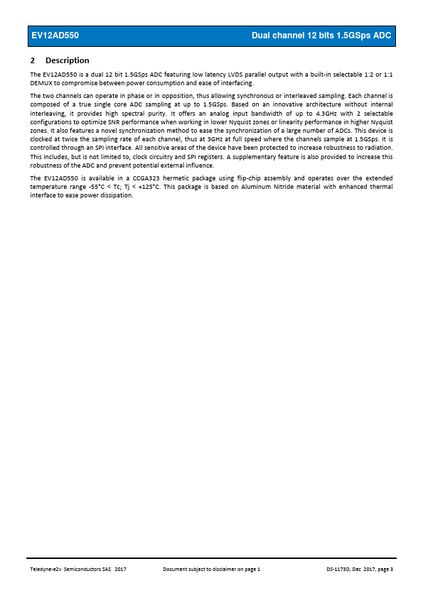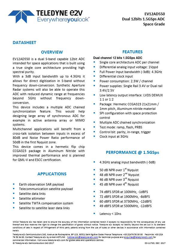 EV12AD550 Dual 12bits 1.5GSps ADC Space Grade DATASHEET OVERVIEW EV12AD550 is a dual S-band capable 12bit ADC intended for space applications that is built using a true single core architecture providing high spectral purity. With a 3dB input bandwidth up to 4.3GHz it allows for direct digitization in S-band without frequency down-conversion. Synthetic Aperture Radar systems will also be able to operate this ADC...