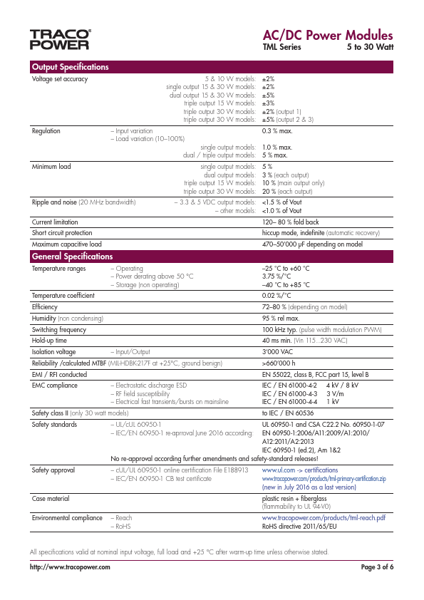 AC/DC Power Modules TML Series, 5­to 30 Watt Features ◆ Encapsulated power Supplies ◆ PCB mount or chassis mount with screw terminals LVD not recommended for new design in ◆ Single, dual and triple output models ◆ Universal input 85–264 VAC, 47–440 Hz ◆ EMI meets EN 55022, class B and FCC, level B ◆ Low ripple and noise ◆ Short circuit and overload protection ◆ 3-year product warranty UL 60950-1 The TML series are ultra compact AC/DC power supplies in a fully encapsulated plastic case. They feature versions with screw terminals for easy installation or with solder pins for direct PCB mounting. International safety approvals qualify this product for worldwide markets.