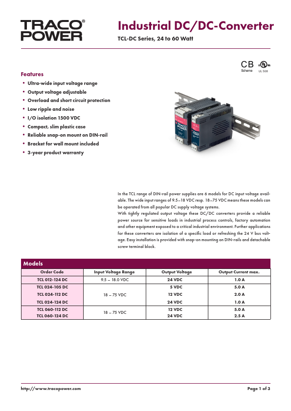 Industrial DC/DC-Converter TCL-DC Series, 24 to 60 Watt.