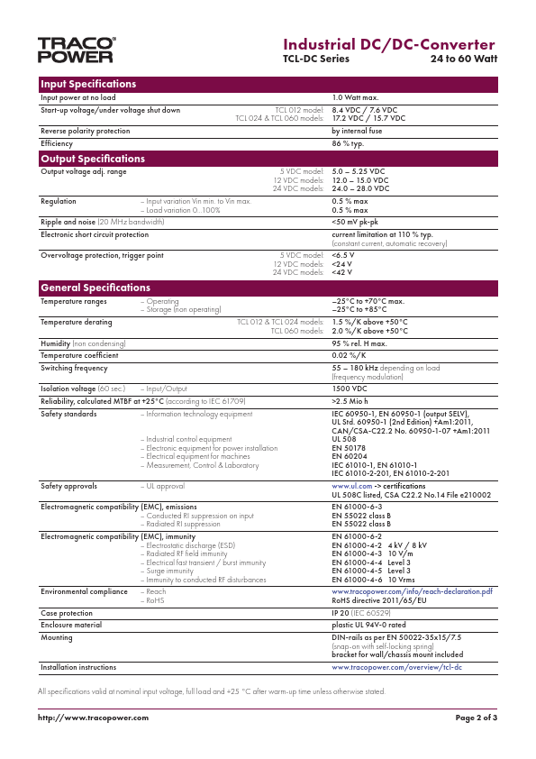 Industrial DC/DC-Converter TCL-DC Series, 24 to 60 Watt.