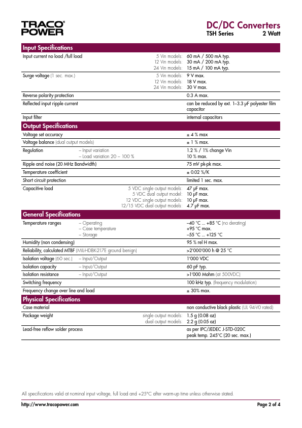 DC/DC Converters TSH Series, 2 Watt.