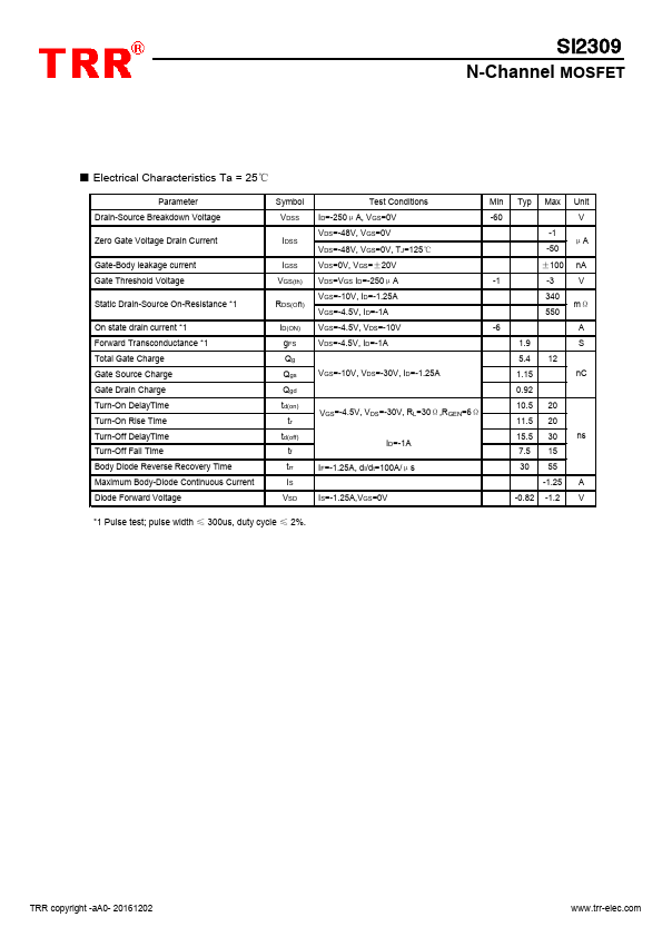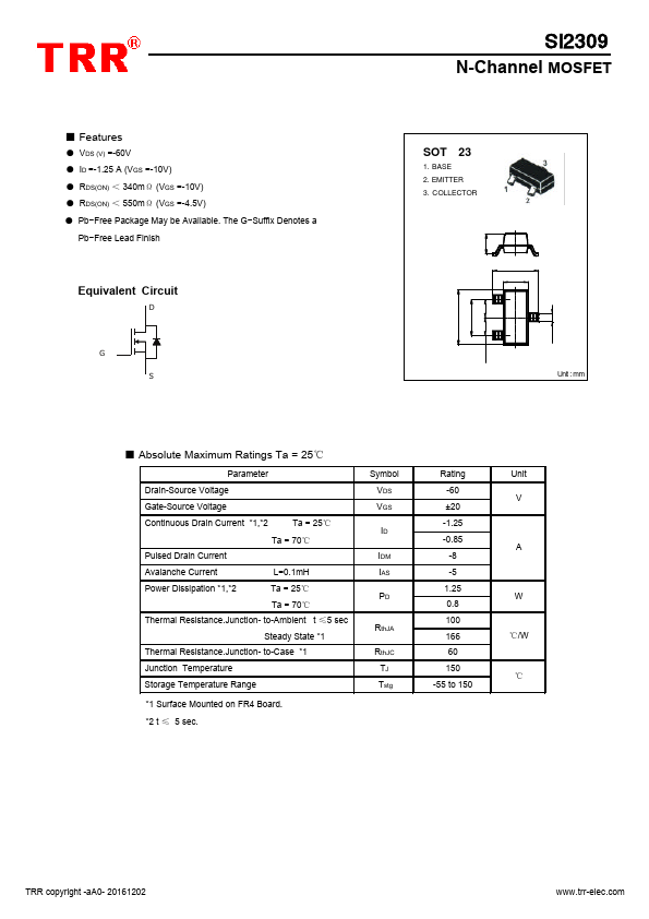 ● VDS (V) =-60V ● ID =-1.25 A (VGS =-10V) ● RDS(ON) < 340mΩ (VGS =-10V) ● RDS(ON) < 550mΩ (VGS =-4.5V) ● Pb−Free Package May be Available. The G−Suffix Denotes a