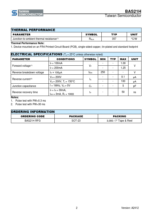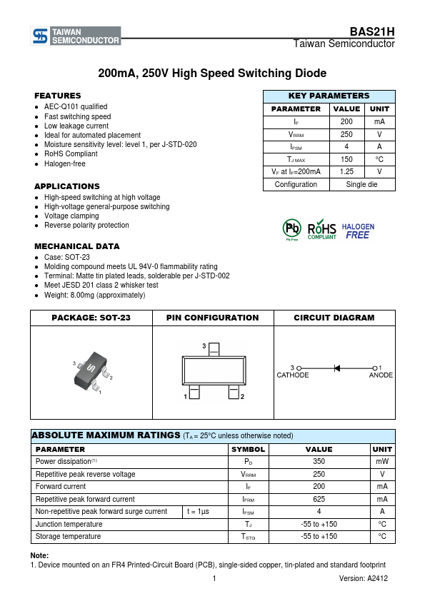 BAS21H Taiwan Semiconductor 200mA, 250V High Speed Switching Diode.