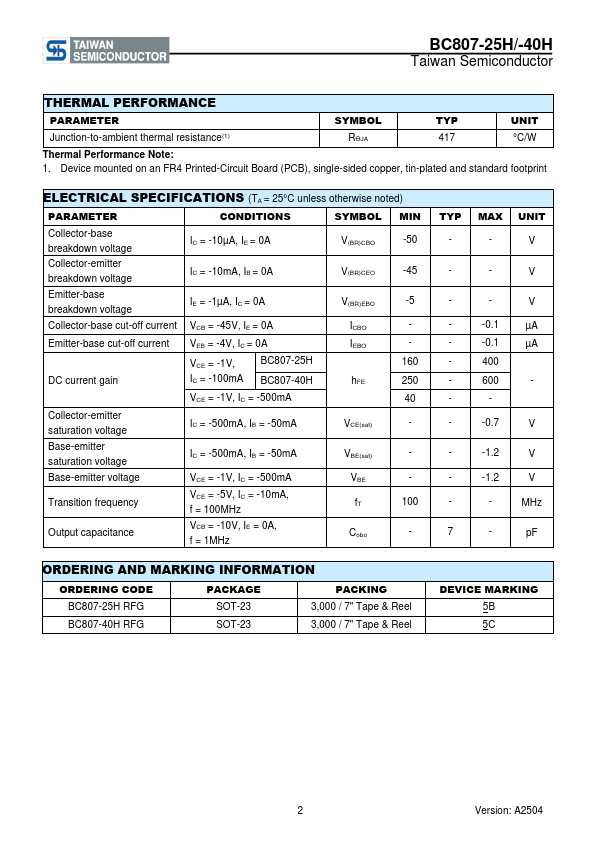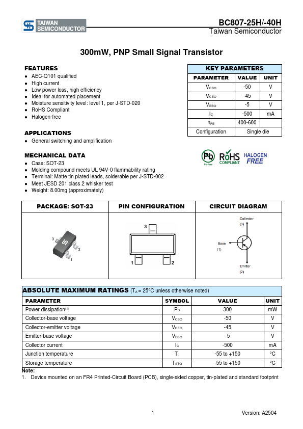 Overview: BC807-25H/-40H Taiwan Semiconductor 300mW, PNP Small Signal Transistor.