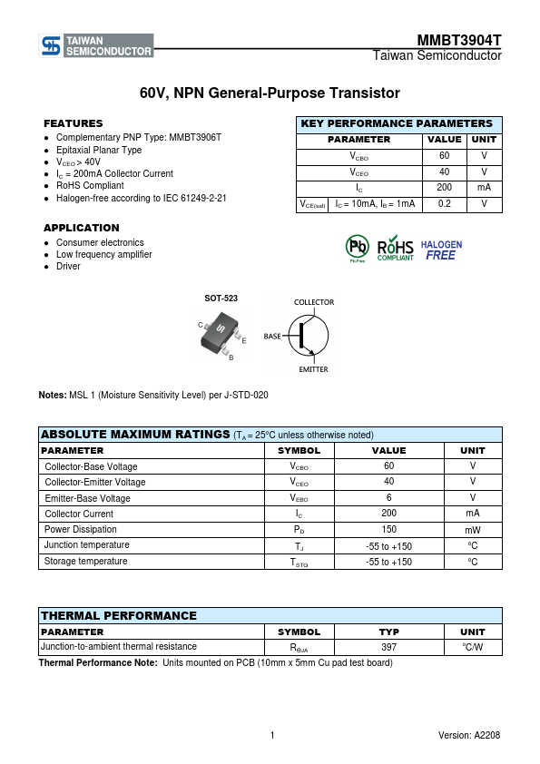 Overview: MMBT3904T Taiwan Semiconductor 60V, NPN General-Purpose Transistor.