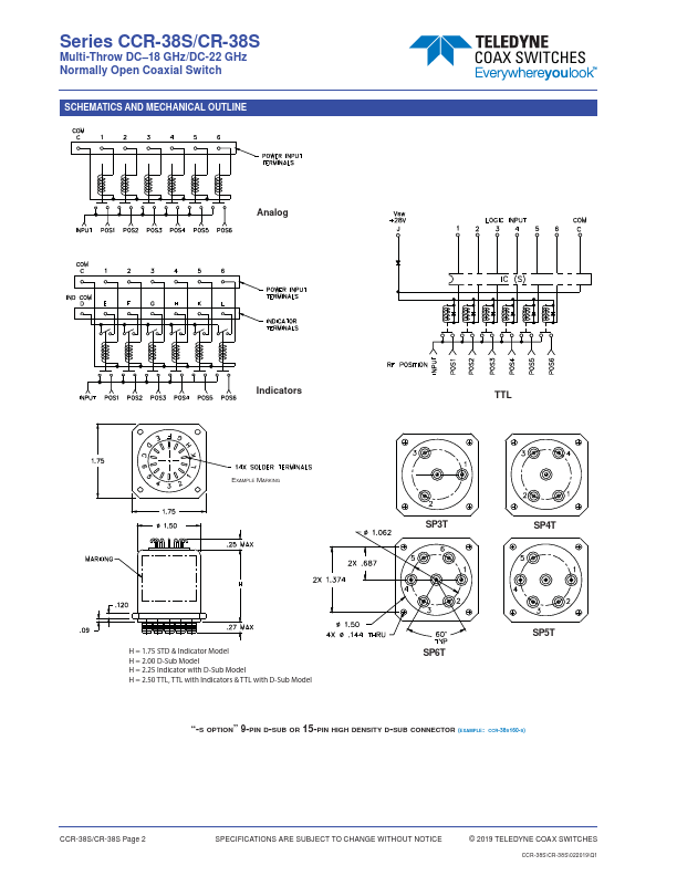 CCR-38S Commercial Normally Open Multi-throw, DC-18GHz CR-38S Elite Normally Open Multi-throw, DC-22GHz The CCR-38S/CR-38S is a broadband, multi-throw, electromechanical coaxial switch designed to switch a microwave signal from a common input to any of 3, 4, 5, or 6 outputs.The characteristic impedance is 50 Ohms.The switches are small using the popular connector spacing on a 1.062” dia.circle.Each position has an individual actuator mechanism allowing random position selection.This al