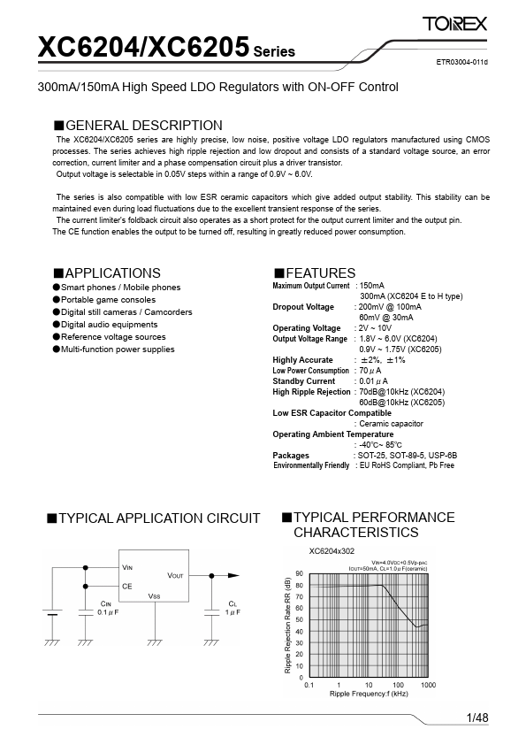 The XC6204/XC6205 series are highly precise, low noise, positive voltage LDO regulators manufactured using CMOS processes. The series achieves high ripple rejection and low dropout and consists of a standard voltage source, an error correction, current limiter and a phase pensation circuit plus a driver transistor. Output voltage is selectable in 0.05V steps within a range of 0.9V ~ 6.0V.