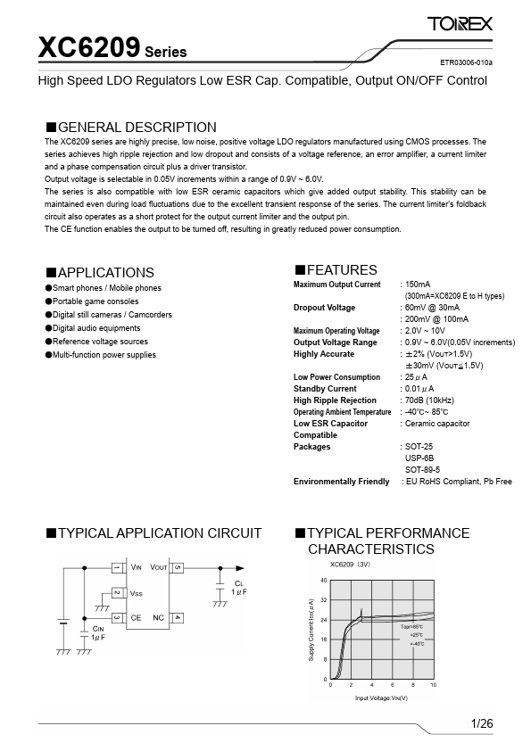 The XC6209 series are highly precise, low noise, positive voltage LDO regulators manufactured using CMOS processes. The series achieves high ripple rejection and low dropout and consists of a voltage reference, an error amplifier, a current limiter and a phase pensation circuit plus a driver transistor. Output voltage is selectable in 0.05V increments within a range of 0.9V ~ 6.0V. The series is also patible with low ESR ceramic capacitors which give added output stability. This stability can be maintained even during load fluctuations due to the excellent transient response of the series. The current limiter's foldback circuit also operates as a short protect for the output current limiter and the output pin. The CE function enables the output to be turned off, resulting in greatly reduced power consumption.