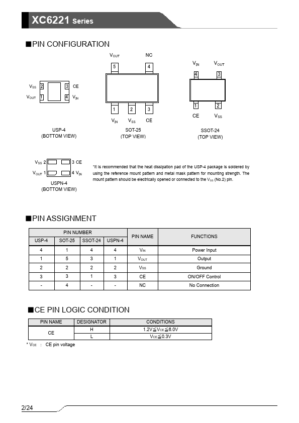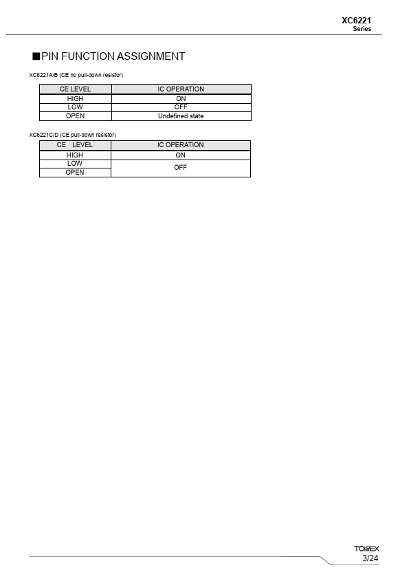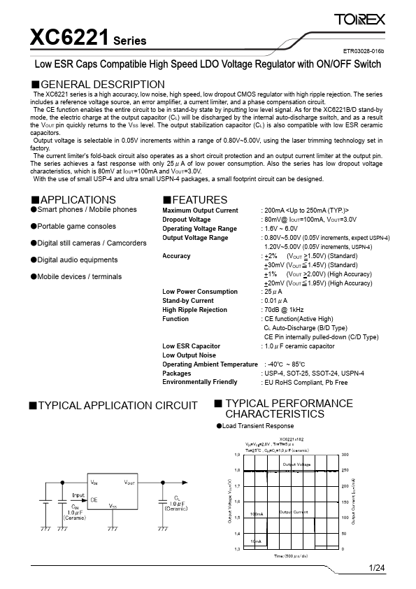 The XC6221 series is a high accuracy, low noise, high speed, low dropout CMOS regulator with high ripple rejection. The series includes a reference voltage source, an error amplifier, a current limiter, and a phase pensation circuit. The CE function enables the entire circuit to be in stand-by state by inputting low level signal.