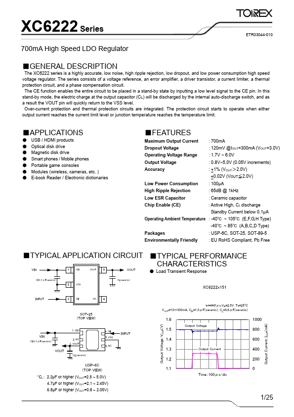 XC6222 is 700mA High Speed LDO Regulator manufactured by Torex Semiconductor.