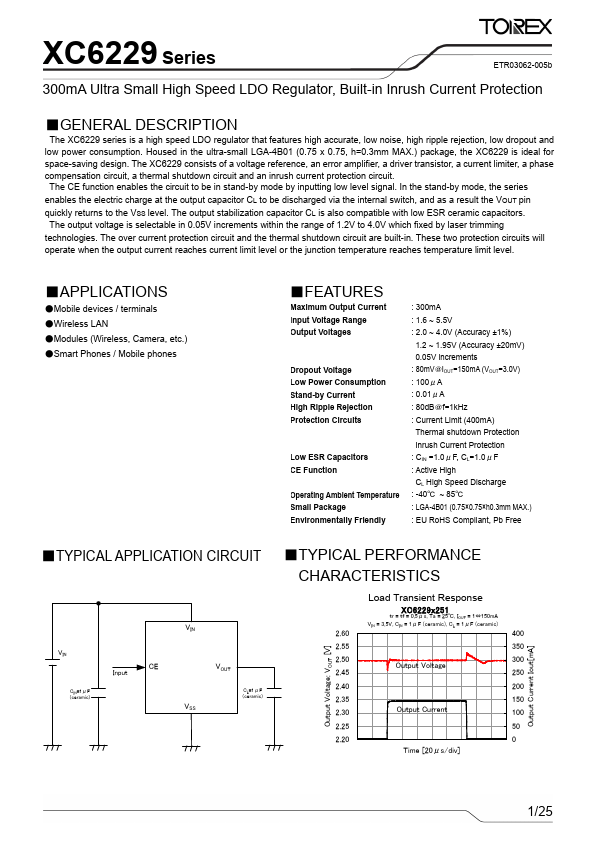 The XC6229 series is a high speed LDO regulator that features high accurate, low noise, high ripple rejection, low dropout and low power consumption.