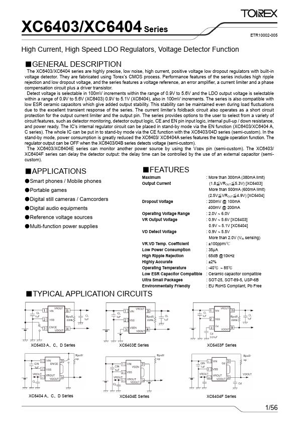 The XC6403/XC6404 series are highly precise, low noise, high current, positive voltage low dropout regulators with built-in voltage detector. They are fabricated using Torex’s CMOS process. Performance Features of the series includes high ripple rejection and low dropout voltage, and the series Features a voltage reference, an error amplifier, a current limiter and a phase pensation circuit plus a driver transistor. Detect voltage is selectable in 100m V increments within the range of 0.9V to 5.6V and the LDO output voltage is selectable within a range of 0.9V to 5.6V (XC6403) 0.9V to 5.1V (XC6404), also in 100m V increments. The series is also patible with low ESR ceramic capacitors which give added output stability. This stability can be maintained even during load fluctuations due to the excellent transient response of the series. The current limiter's foldback circuit also operates as a short circuit protection for the output current limiter and the output pin. The series provides options to the user to select from a variety of circuit Features