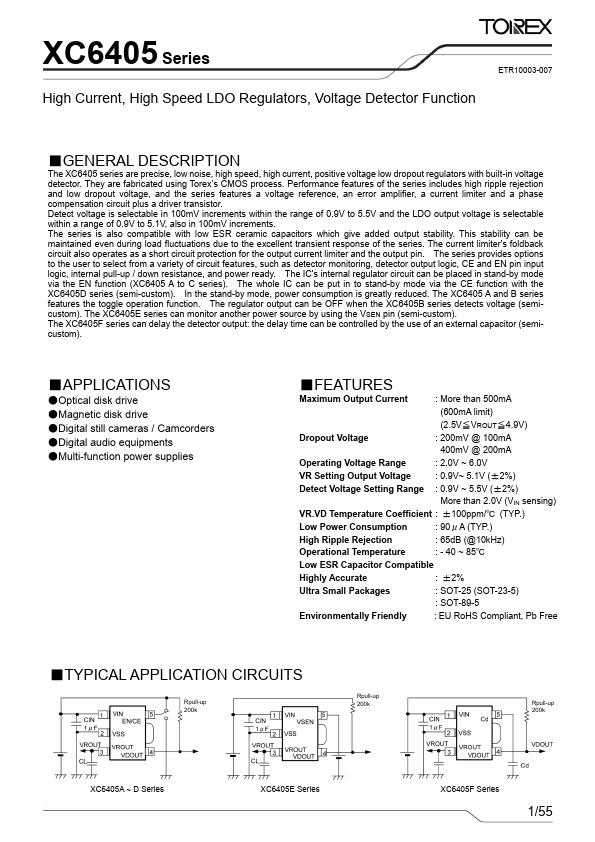 The XC6405 series are precise, low noise, high speed, high current, positive voltage low dropout regulators with built-in voltage detector. They are fabricated using Torex’s CMOS process. Performance Features of the series includes high ripple rejection and low dropout voltage, and the series Features a voltage reference, an error amplifier, a current limiter and a phase pensation circuit plus a driver transistor. Detect voltage is selectable in 100m V increments within the range of 0.9V to 5.5V and the LDO output voltage is selectable within a range of 0.9V to 5.1V, also in 100m V increments. The series is also patible with low ESR ceramic capacitors which give added output stability. This stability can be maintained even during load fluctuations due to the excellent transient response of the series. The current limiter's foldback circuit also operates as a short circuit protection for the output current limiter and the output pin. The series provides options to the user to select from a variety of circuit Features
