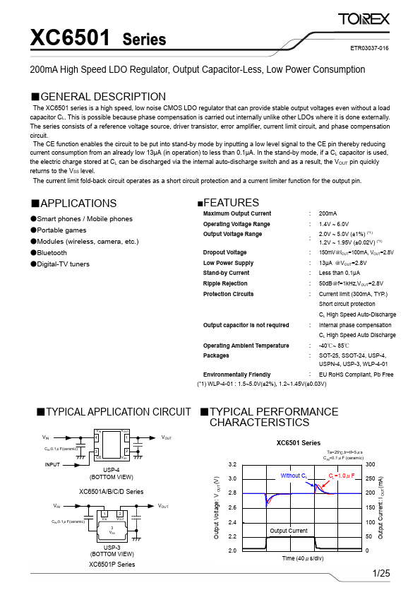 The XC6501 series is a high speed, low noise CMOS LDO regulator that can provide stable output voltages even without a load capacitor CL. This is possible because phase pensation is carried out internally unlike other LDOs where it is done externally. The series consists of a reference voltage source, driver transistor, error amplifier, current limit circuit, and phase pensation circuit. The CE function enables the circuit to be put into stand-by mode by inputting a low level signal to the CE pin thereby reducing current consumption from an already low 13μA (in operation) to less than 0.1μA. In the stand-by mode, if a CL capacitor is used, the electric charge stored at CL can be discharged via the internal auto-discharge switch and as a result, the VOUT pin quickly returns to the VSS level.