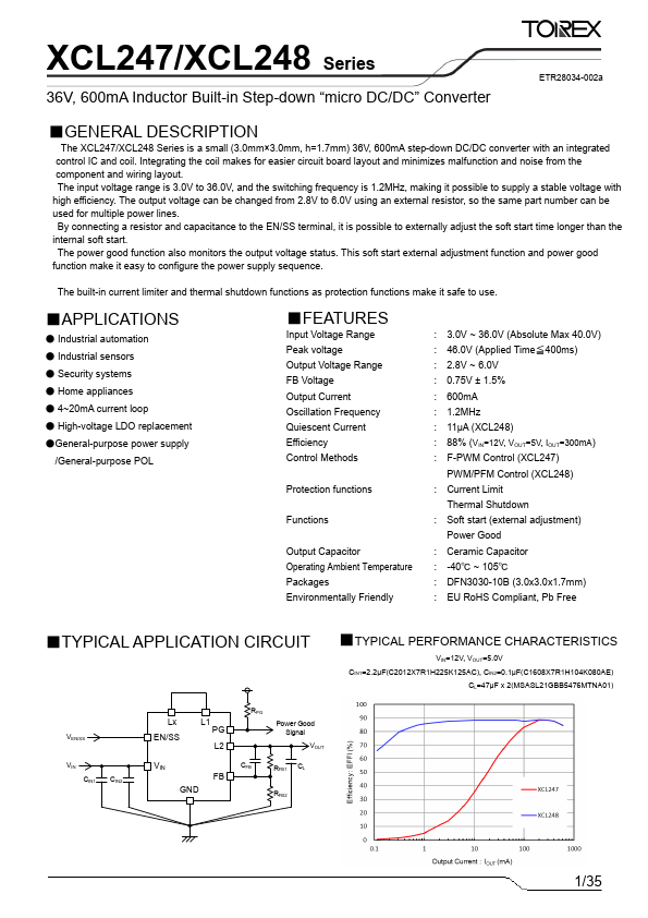The XCL247/XCL248 Series is a small (3.0mm×3.0mm, h=1.7mm) 36V, 600m A step-down DC/DC converter with an integrated control IC and coil. Integrating the coil makes for easier circuit board layout and minimizes malfunction and noise from the ponent and wiring layout. The input voltage range is 3.0V to 36.0V, and the switching frequency is 1.2MHz, making it possible to supply a stable voltage with high efficiency. The output voltage can be changed from 2.8V to 6.0V using an external resistor, so the same part number can be used for multiple power lines. By connecting a resistor and capacitance to the EN/SS terminal, it is possible to externally adjust the soft start time longer than the internal soft start. The power good function also monitors the output voltage status. This soft start external adjustment function and power good function make it easy to configure the power supply sequence.