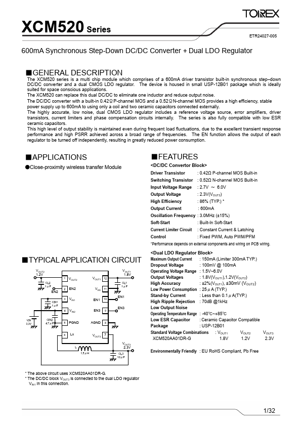 The XCM520 series is a multi chip module which prises of a 600mA driver transistor built-in synchronous step-down DC/DC converter and a dual CMOS LDO regulator.