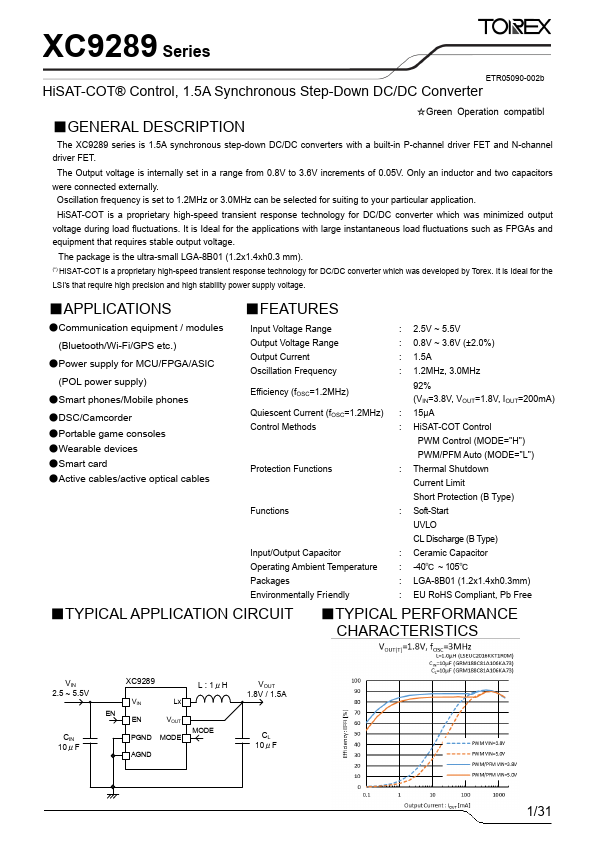 The XC9289 series is 1.5A synchronous step-down DC/DC converters with a built-in P-channel driver FET and N-channel driver FET. The Output voltage is internally set in a range from 0.8V to 3.6V increments of 0.05V. Only an inductor and two capacitors were connected externally. Oscillation frequency is set to 1.2MHz or 3.0MHz can be selected for suiting to your particular application.
