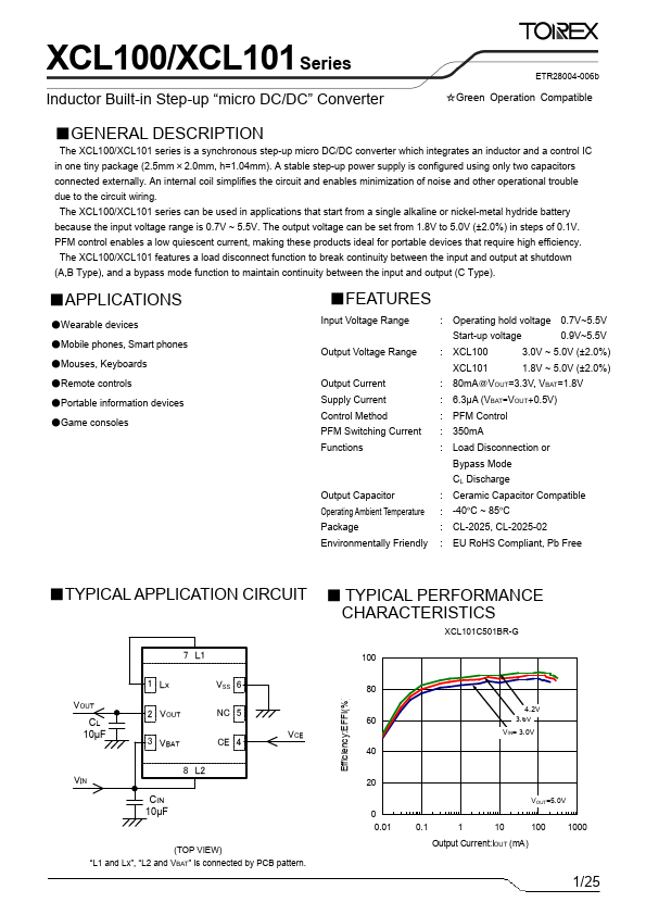 The XCL100/XCL101 series is a synchronous step-up micro DC/DC converter which integrates an inductor and a control IC in one tiny package (2.5mm×2.0mm, h=1.04mm). A stable step-up power supply is configured using only two capacitors connected externally. An internal coil simplifies the circuit and enables minimization of noise and other operational trouble due to the circuit wiring.