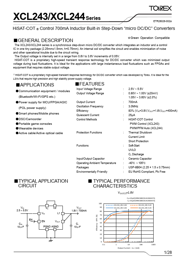 XCL243/XCL244 Series ETR28028-002a HiSAT-COT ® Control 700mA Inductor Built-in Step-Down “micro DC/DC” Converters - GENERAL DESCRIPTION ☆Green Operation patible The XCL243/XCL244 series is a synchronous step-down micro DC/DC converter which integrates an inductor and a control IC in one tiny package (2.25mmx1.5mm, h=0.75mm). An internal coil simplifies the circuit and enables minimization of noise and other operational trouble due to the circuit wiring. The Output voltage is internally set in a range from 0.8V to 3.6V increments of 0.05V. HiSAT-COT is a proprietary high-speed transient response technology for DC/DC converter which was minimized output voltage during load...