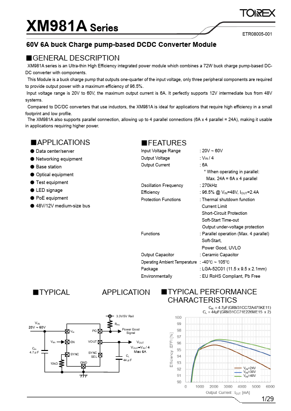 XM981A series is an Ultra-thin High Efficiency integrated power module which bines a 72W buck charge pump-based DCDC converter with ponents. This Module is a buck charge pump that outputs one-quarter of the input voltage, only three peripheral ponents are required to provide output power with a maximum efficiency of 96.5%. Input voltage range is 20V to 60V, the maximum output current is 6A. It perfectly supports 12V intermediate bus from 48V systems. pared to DC/DC converters that use inductors, the XM981A is ideal for applications that require high efficiency in a small...