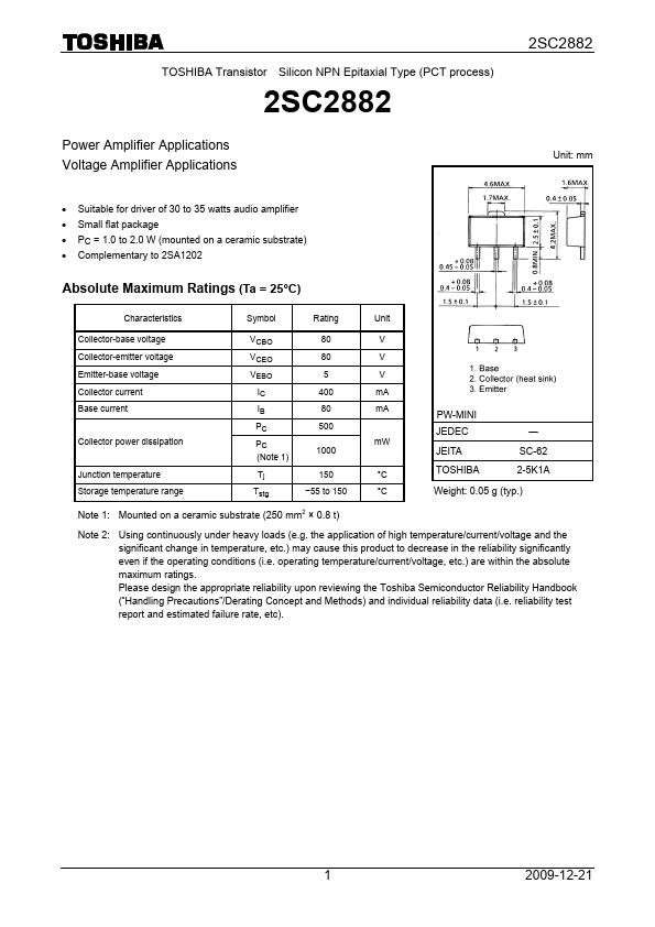 Overview: TOSHIBA Transistor Silicon NPN Epitaxial Type (PCT process) 2SC2882 Power Amplifier Applications Voltage Amplifier Applications 2SC2882 Unit: mm • Suitable for driver of 30 to 35 watts audio.