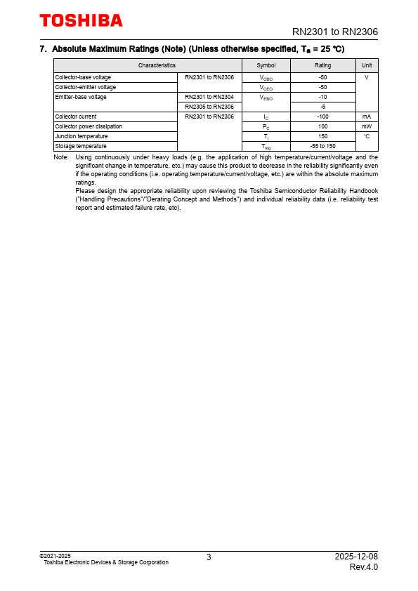 Overview: RN2301 to RN2306 Bipolar Transistors Silicon PNP Epitaxial Type (PCT Process)(Bias Resistor built-in Transistor) RN2301/02/03/04/05/06 1. Applications • Switching • Inverter Circuits • Interfacing • Driver Circuits 2.