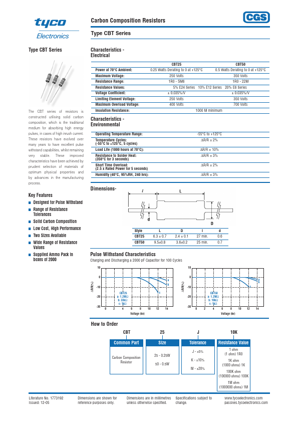 Carbon position Resistors Type CBT Series Type CBT Series The CBT series of resistors is constructed utilising solid carbon position, which is the traditional medium for absorbing high energy pulses, in cases of high inrush current. These resistors have evolved over many years to have excellent pulse withstand capabilities, whilst remaining very stable. These improved characteristics have been achieved by prudent...