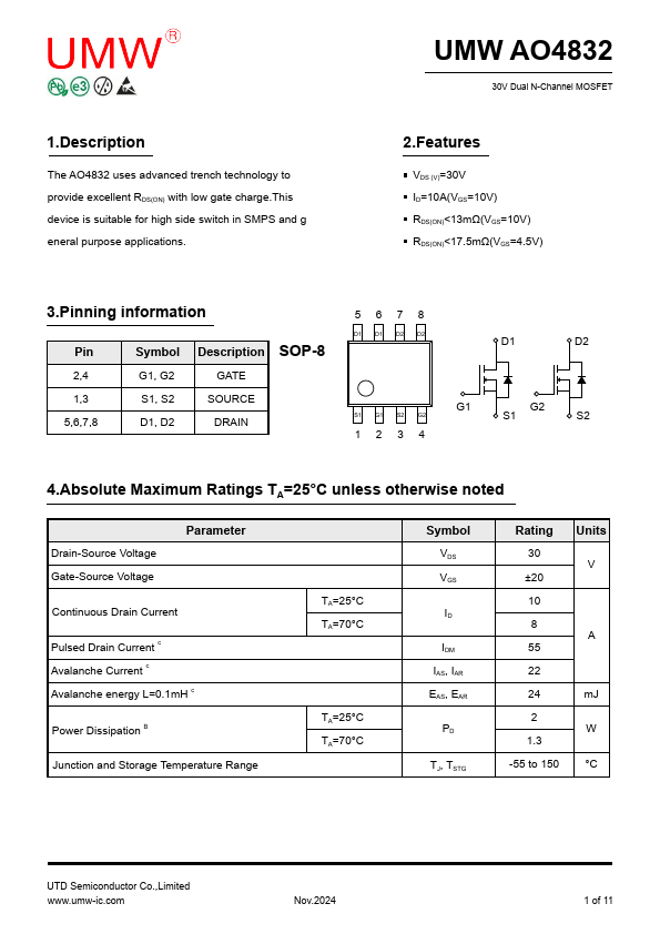 The AO4832 uses advanced trench technology to provide excellent RDS(ON) with low gate charge.This device is suitable for high side switch in SMPS and g eneral purpose applications.