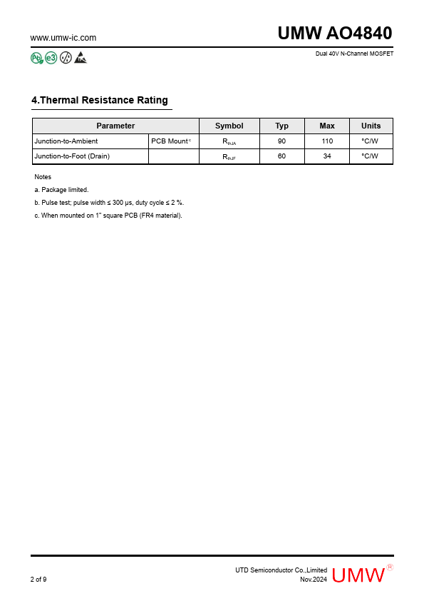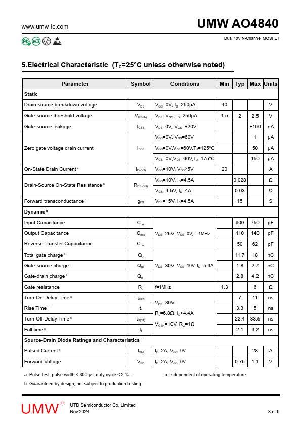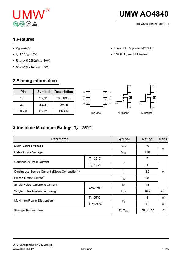 VDS (V)=40V ID=7A(VGS=10V) RDS(ON)<0.028Ω(VGS=10V) RDS(ON)<0.03Ω(VGS=4.5V)