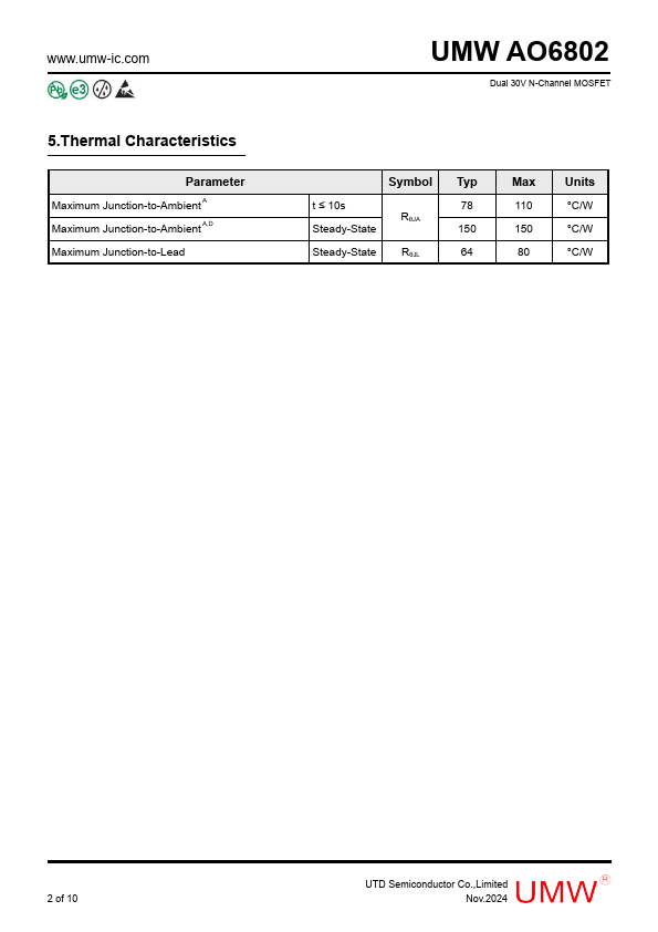 The AO6802 uses advanced trench technology to provide excellent RDS(ON) and low gate charge. This device is suitable for use as a load switch or in PWM applications.