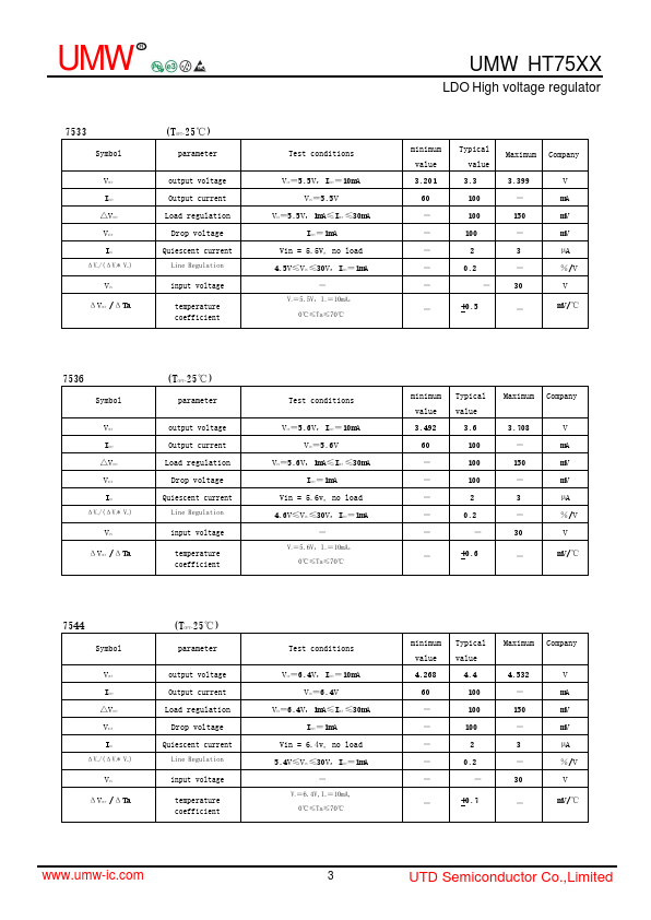 UMW R UMW HT75XX LDO High voltage regulator Product introdution 75xx series is a low-power high-voltage regulator manufactured by CMOS process. The maximum input voltage is 30V and the output voltage range is 1.5V~12.0V.It has the characteristics of high precision output voltage, very low power supply current and very low drop voltage.