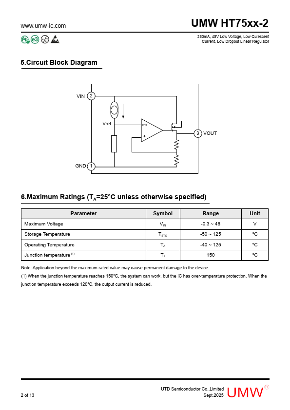The UMW HT75xx-2 is a low-dropout linear voltage regulator using CMOS technology. It has a 45V voltage rating and offers several fixed output voltages ranging from 2.0V to 5.0V, capable of outputting 250mA of current.