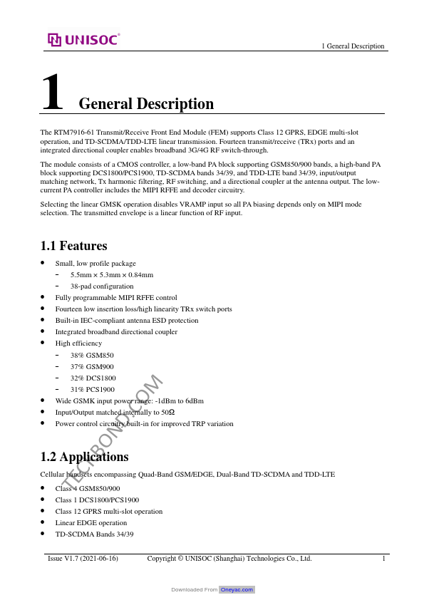 1 General Description The RTM7916-61 Transmit/Receive Front End Module (FEM) supports Class 12 GPRS, EDGE multi-slot operation, and TD-SCDMA/TDD-LTE linear transmission. Fourteen transmit/receive (TRx) ports and an integrated directional coupler enables broadband 3G/4G RF switch-through. The module consists of a CMOS controller, a low-band PA block supporting GSM850/900 bands, a high-band PA block supporting...