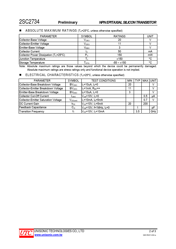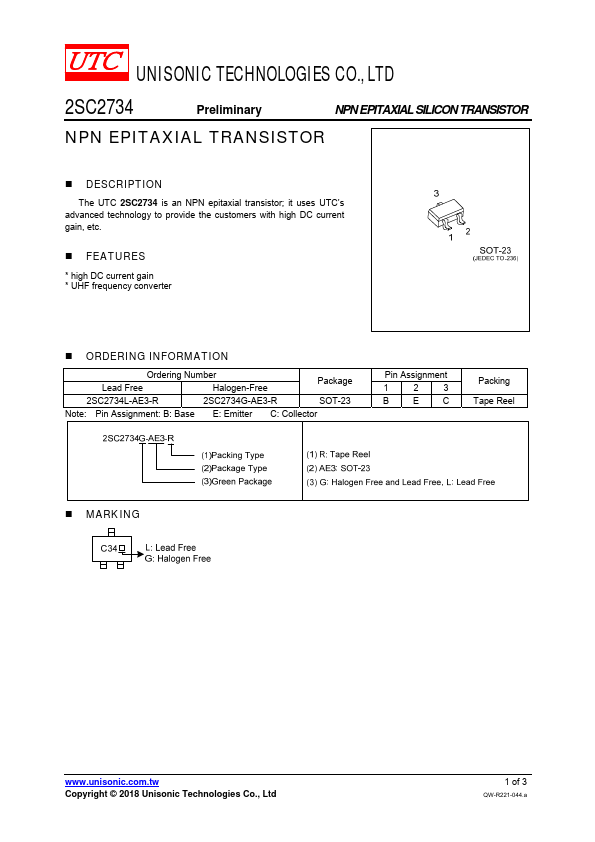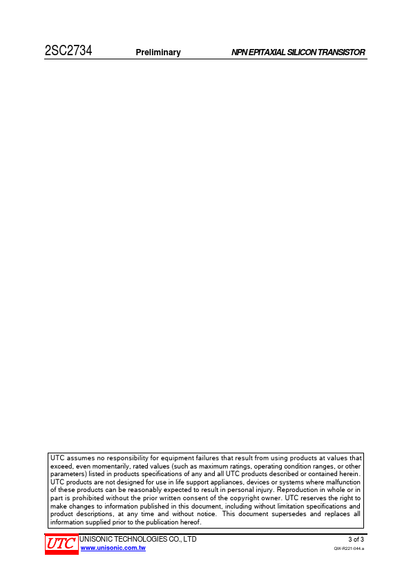 Overview: UNISONIC TECHNOLOGIES CO., LTD 2SC2734 Preliminary NPN EPITAXIAL SILICON TRANSISTOR NPN EPITAXIAL TRANSISTOR.