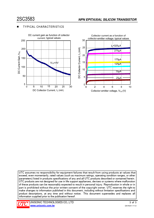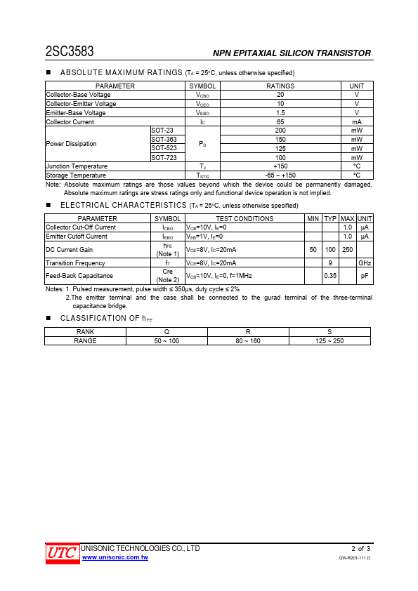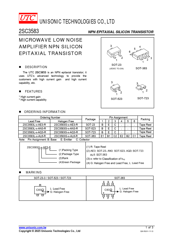 Overview: UNISONIC TECHNOLOGIES CO., LTD 2SC3583 NPN EPITAXIAL SILICON TRANSISTOR MICROWAVE LOW NOISE AMPLIFIER NPN SILICON EPITAXIAL.