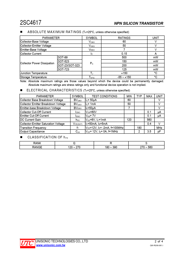 Overview: UNISONIC TECHNOLOGIES CO., LTD 2SC4617 NPN SILICON TRANSISTOR GENERAL PURPOSE TRANSISTOR.