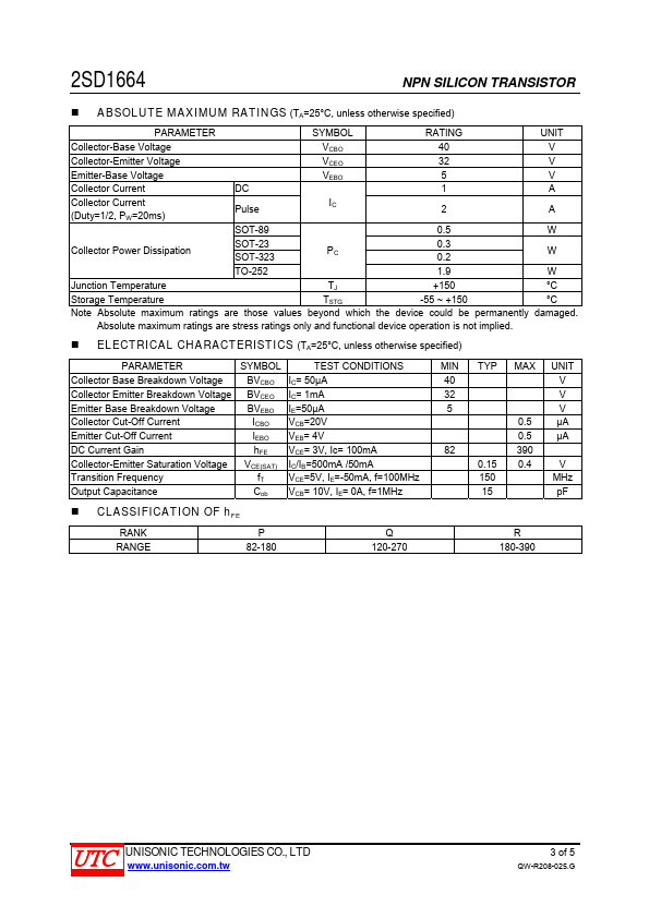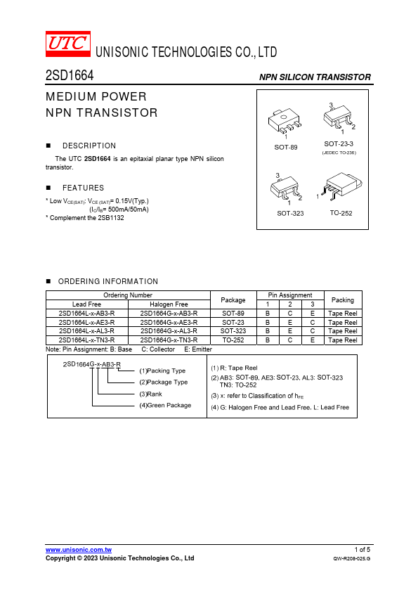 Overview: UNISONIC TECHNOLOGIES CO., LTD 2SD1664 NPN SILICON TRANSISTOR MEDIUM POWER NPN TRANSISTOR.