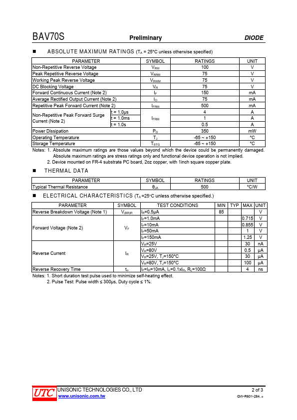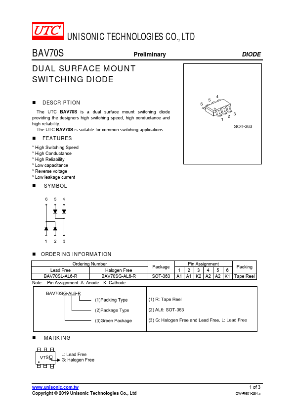 The UTC BAV70S is a dual surface mount switching diode providing the designers high switching speed, high conductance and high reliability. The UTC BAV70S is suitable for mon switching applications.