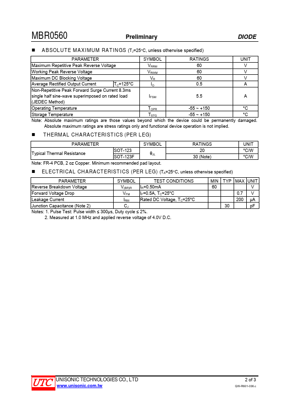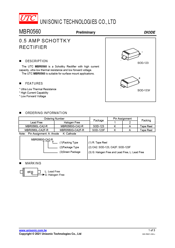 The UTC MBR0560 is a Schottky Rectifier with high current capacity, ultra low and low forward voltage. The UTC MBR0560 is suitable for surface mount applications.
